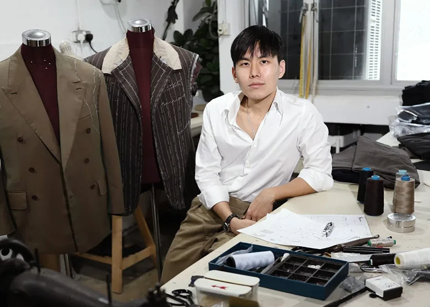 Alexander K in the atelier, with two work-in-progress’ jackets by the side.