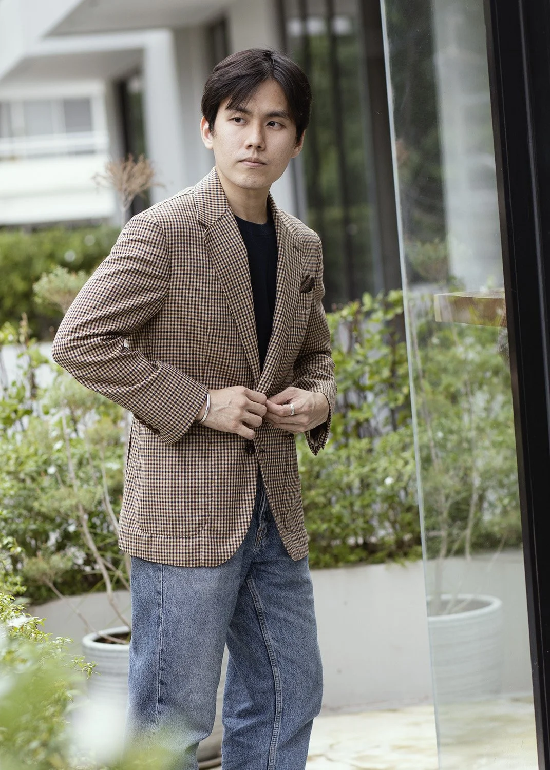 Leisure Look A - Wearing TCR1982 Wool & Silk Sport Jacket, paired with Navy inner knit, and denim jeans.