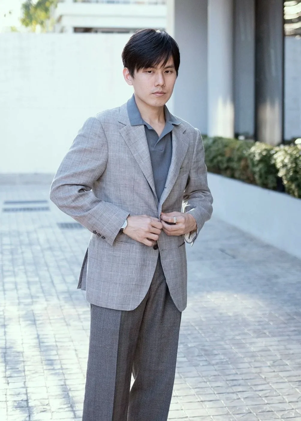 Leisure Look B - Wearing TCR1982 Wool, Silk and Linen jacket, paired with an cotton knitted-polo shirt, and wool trousers.