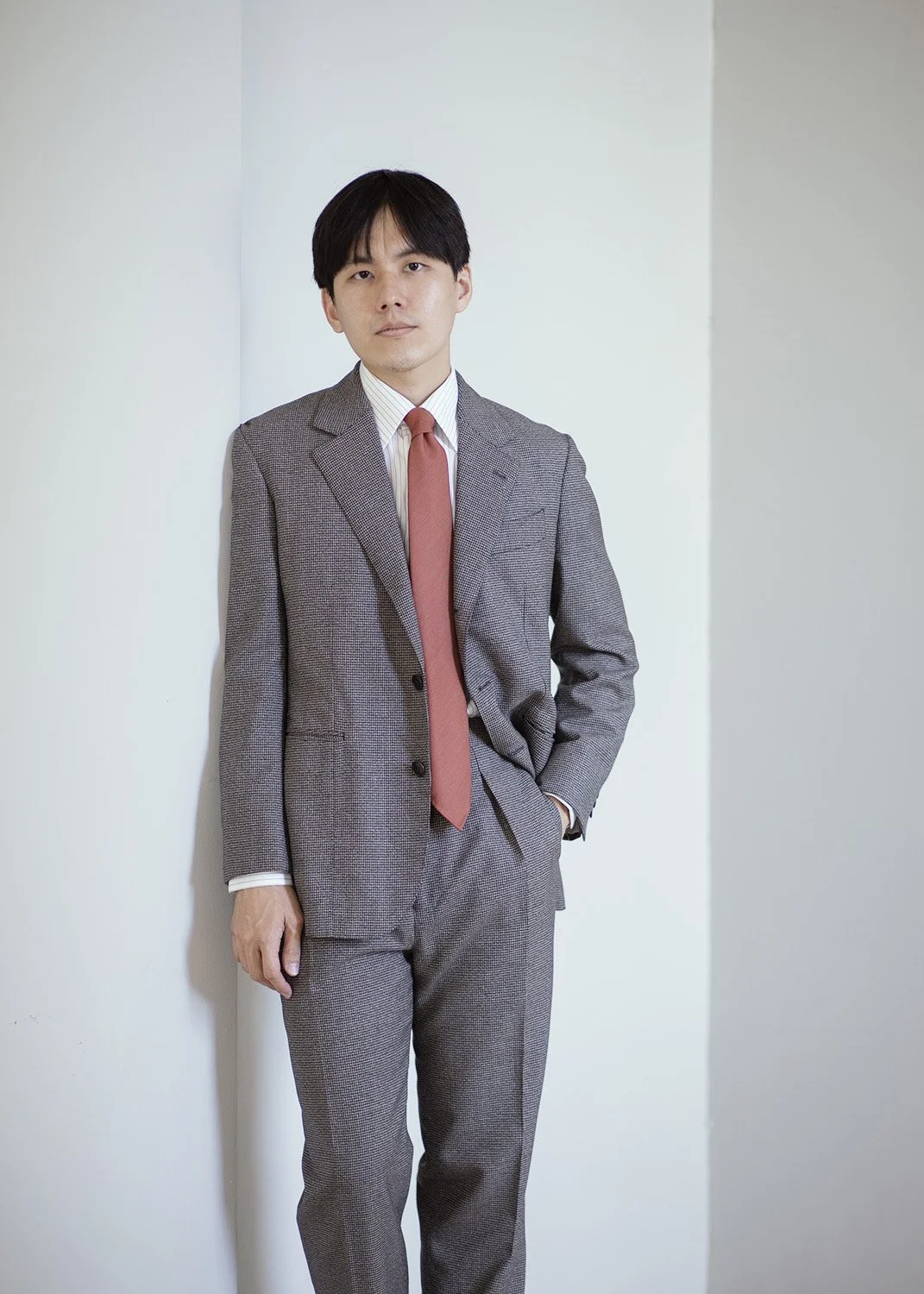Professional Look A - Wearing TCR1982 Standard Bespoke Suit in Puppy-tooth Grey, paired with a gentle stripe shirt and reversed-Solaro necktie.